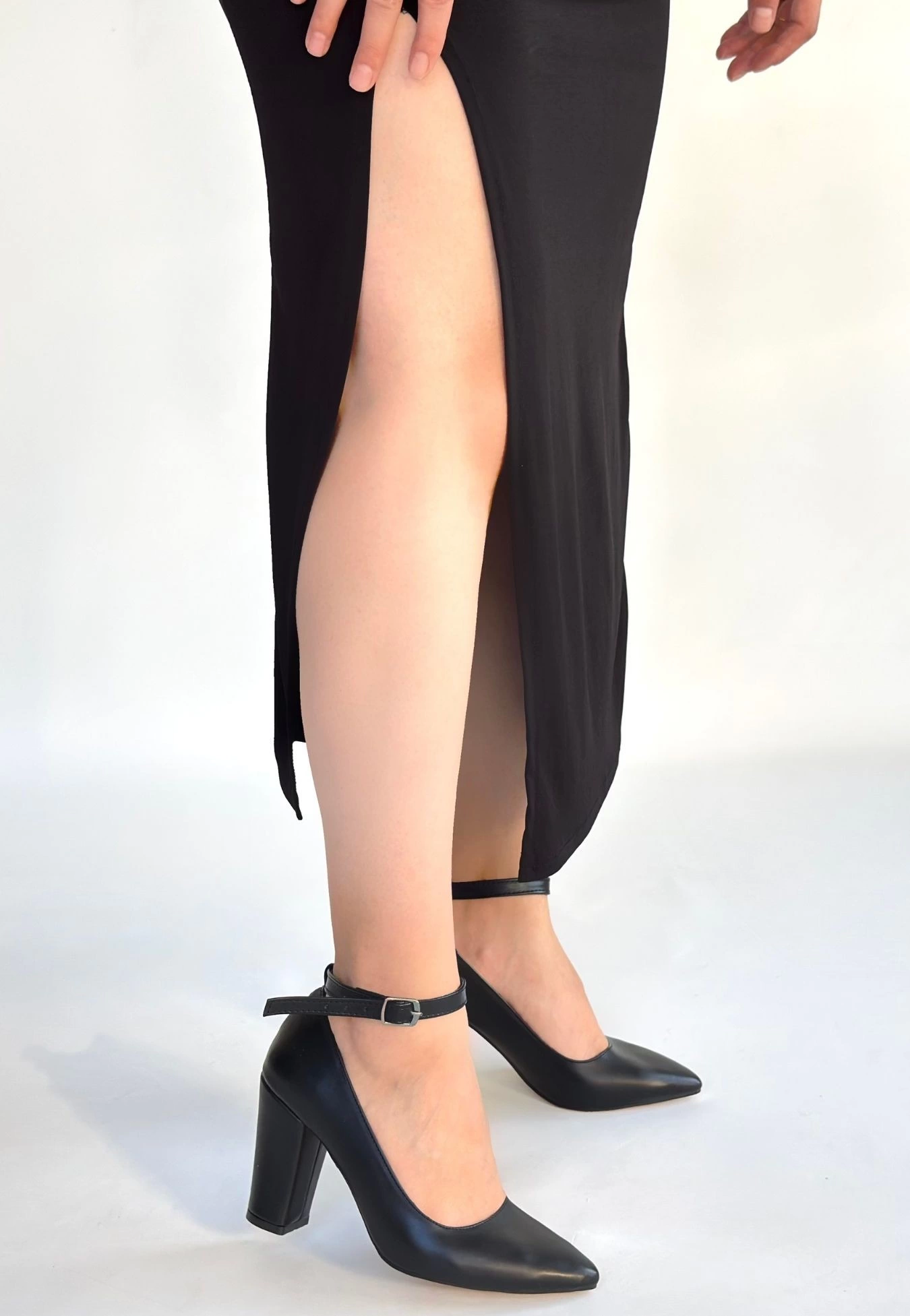 Kadın Askılı Degaje Yakalı Yırtmaçlı Kadife Midi Elbise