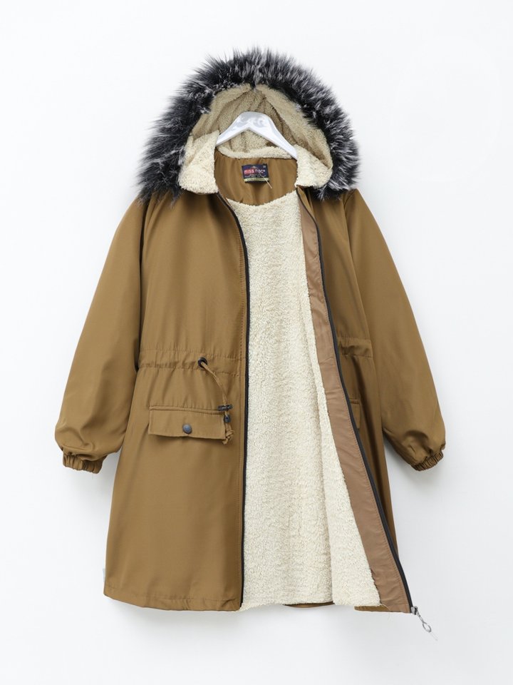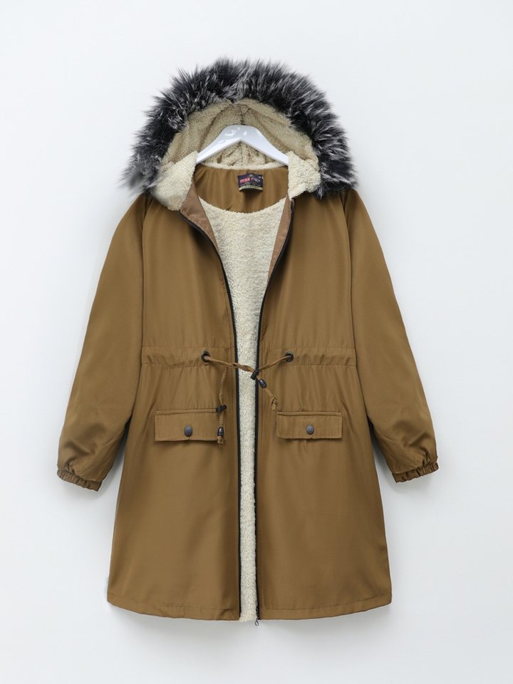 Sabit Kapşonlu İçi Kürklü Bondit Kaban -Taba