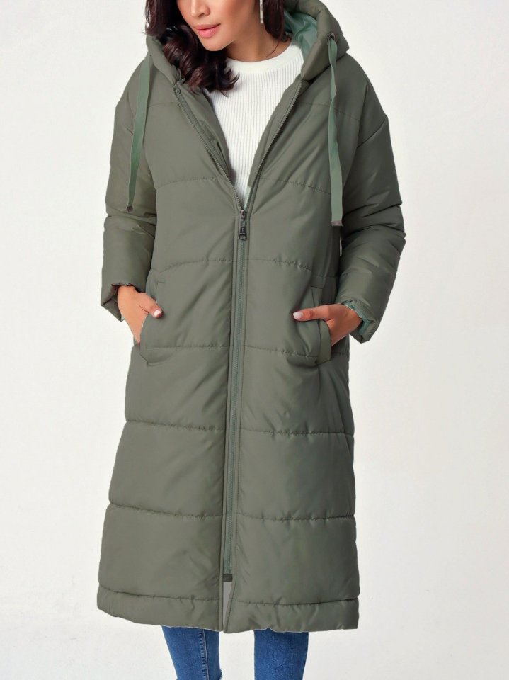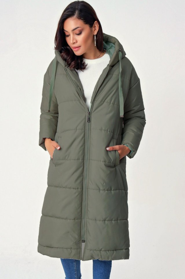 Sabit Kapşonlu Kuş Gözü Detaylı Uzun Kaban -Haki