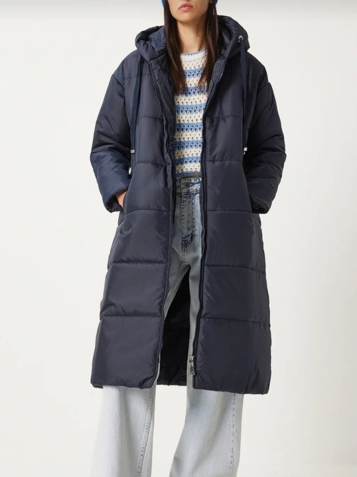 Sabit Kapşonlu Kuş Gözü Detaylı Uzun Kaban -Laci