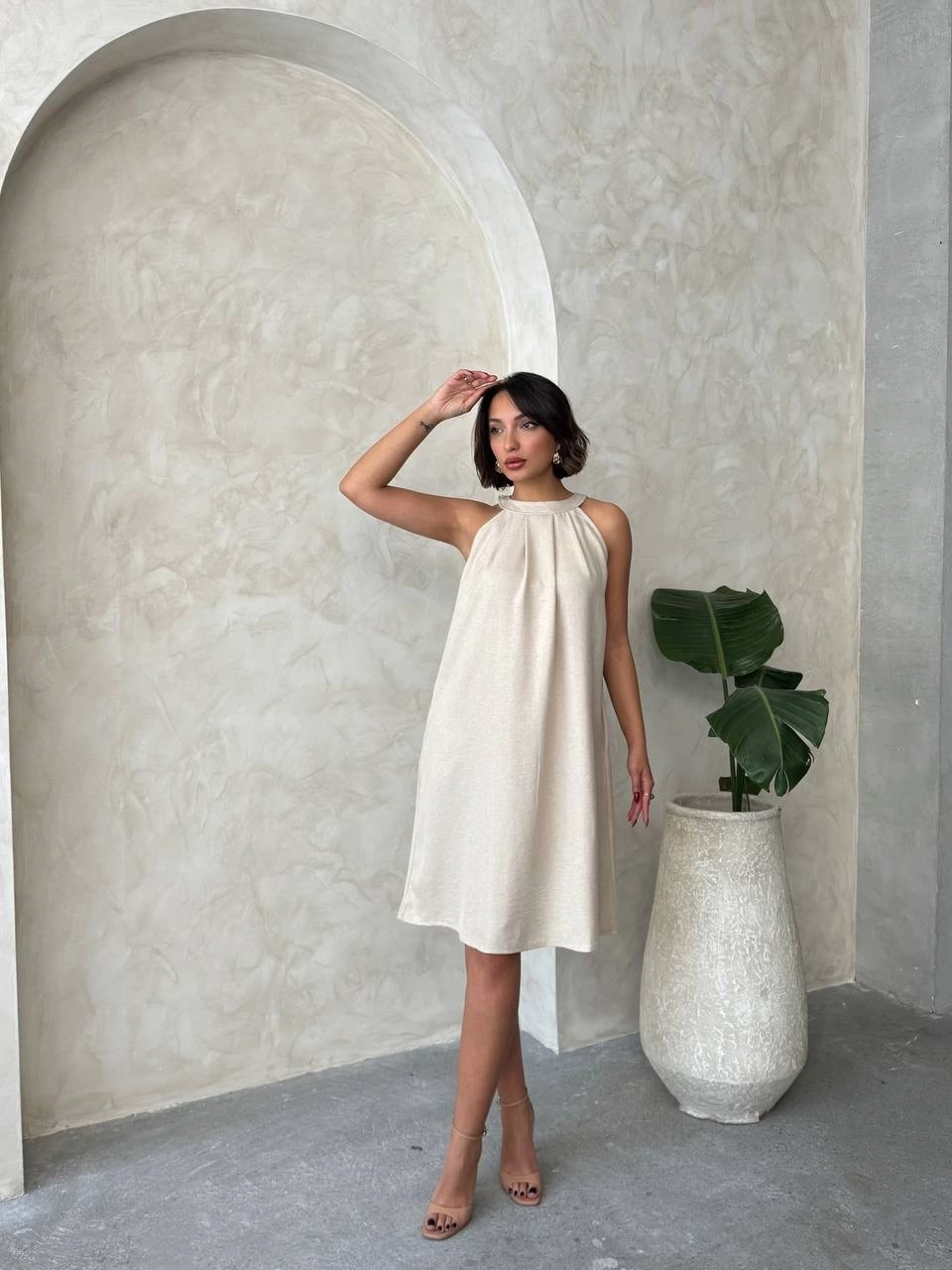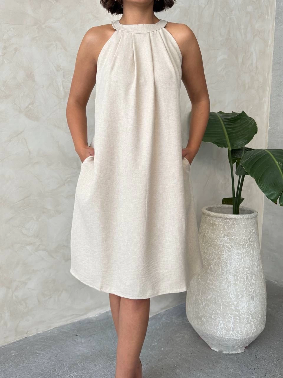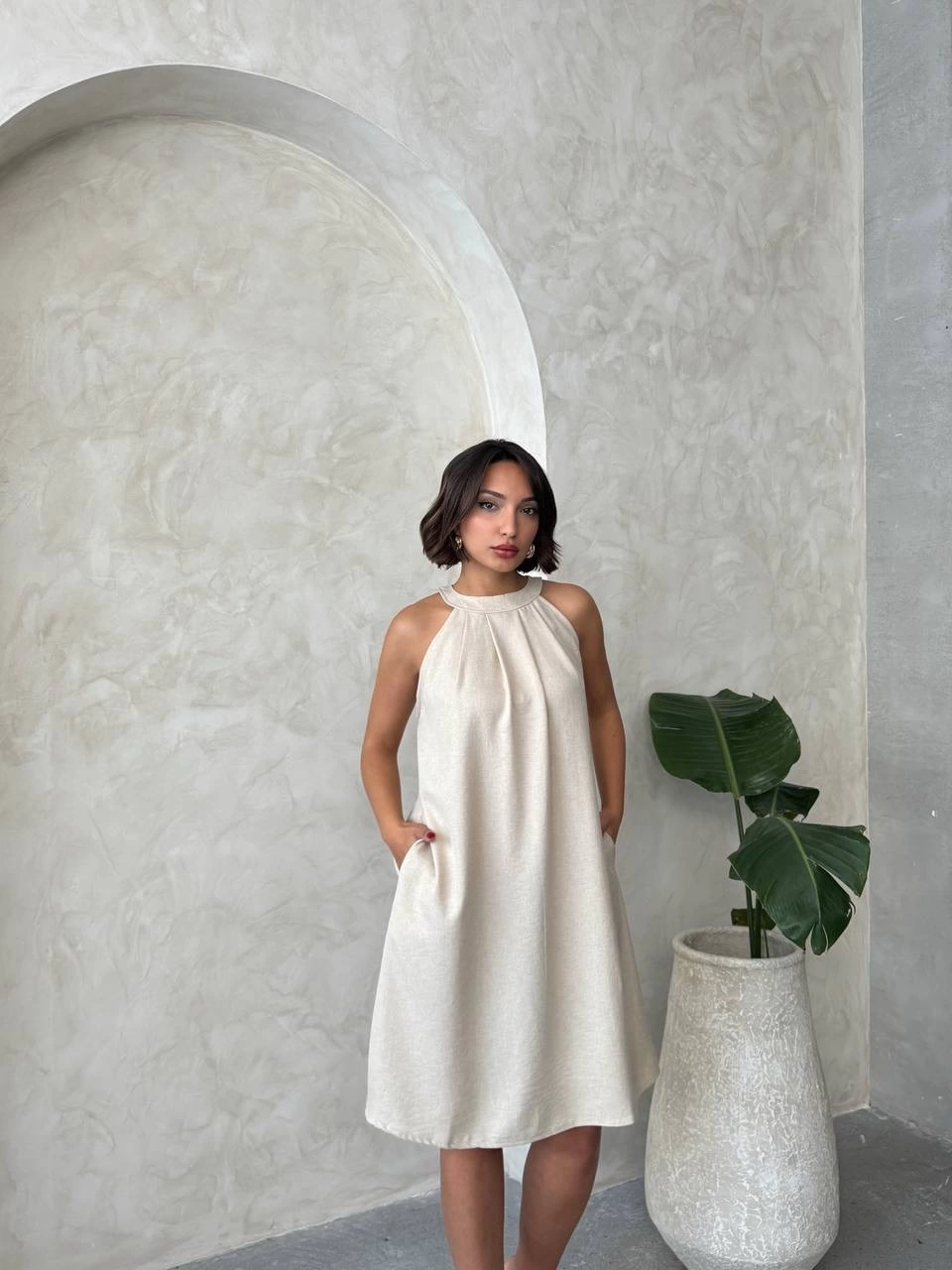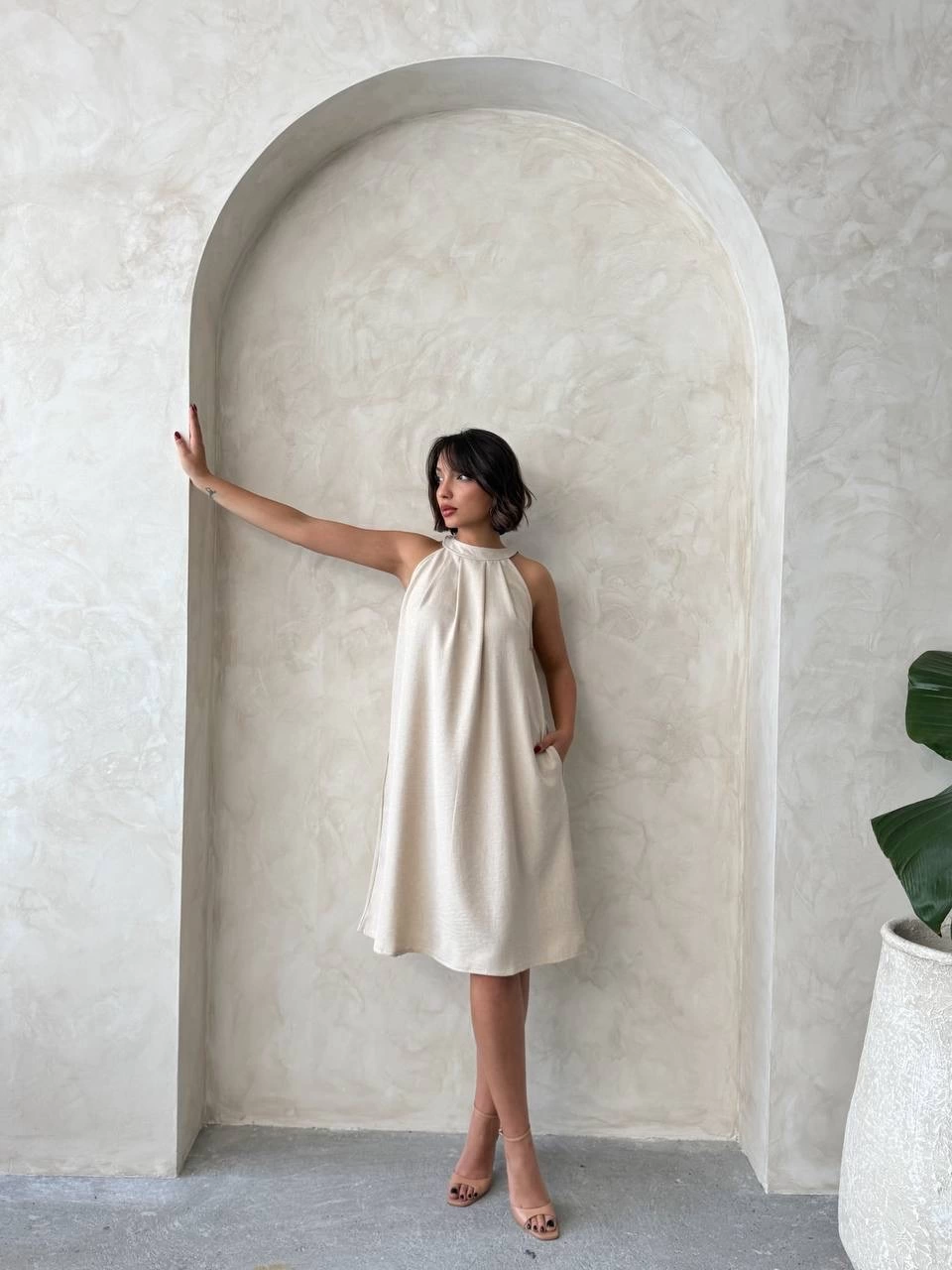 Kadın Kısa Kollu Yakası Açık Katlı Bürümcük Balon Elbise