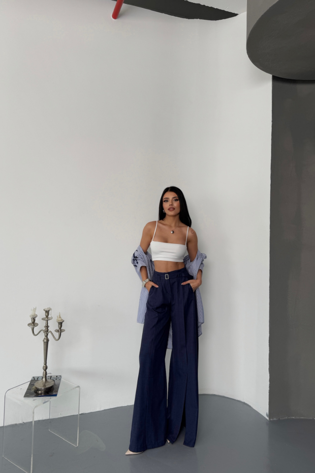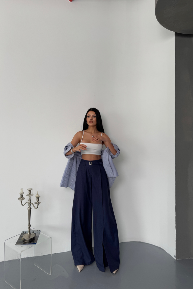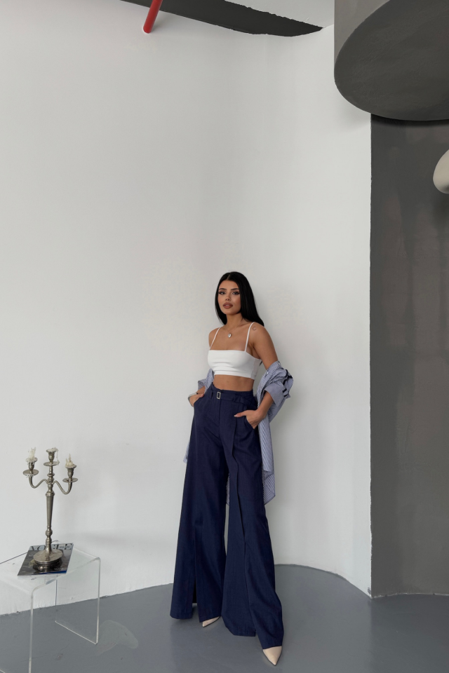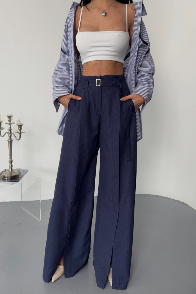 SALAŞ ÖNDEN YIRTMAÇ DETAYLI BEL KEMERLİ PANTOLON - Lacivert