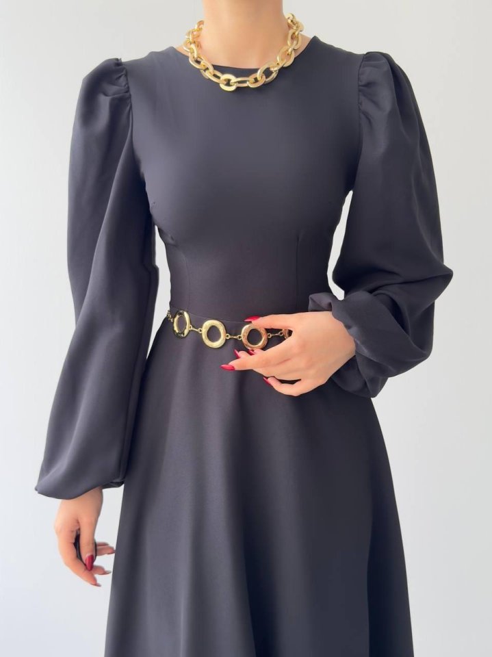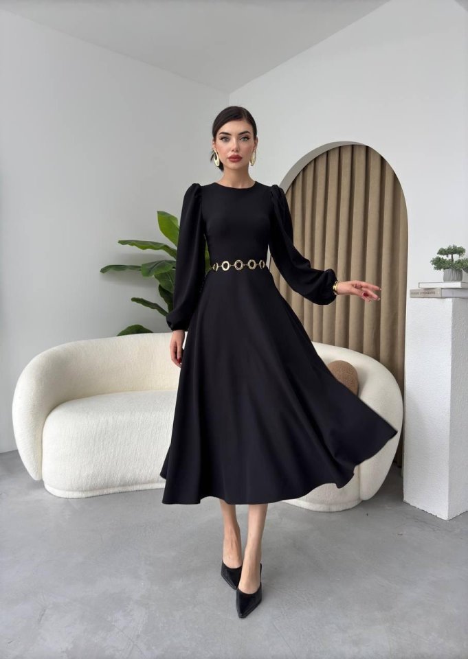 Kadın Uzun Kollu Kruvaze Yaka Büzgü Ve Balon Kol Detay Krep Kumaş Maxi Boy Elbise