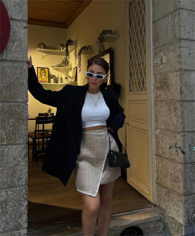 ŞANELKAPAKLI ÇOBAN DİKİŞ DETAYLI KISA ETEK - Bej