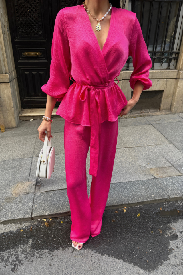 SATEN KRUVAZE BAĞLAMALI BLUZ- PANTOLON TAKIM - Fuşya