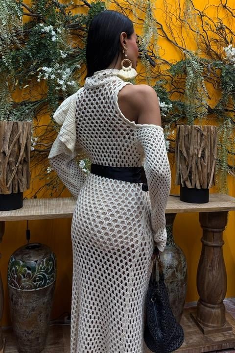 Saten Kuşaklı Ajurlu Triko Elbise 2847