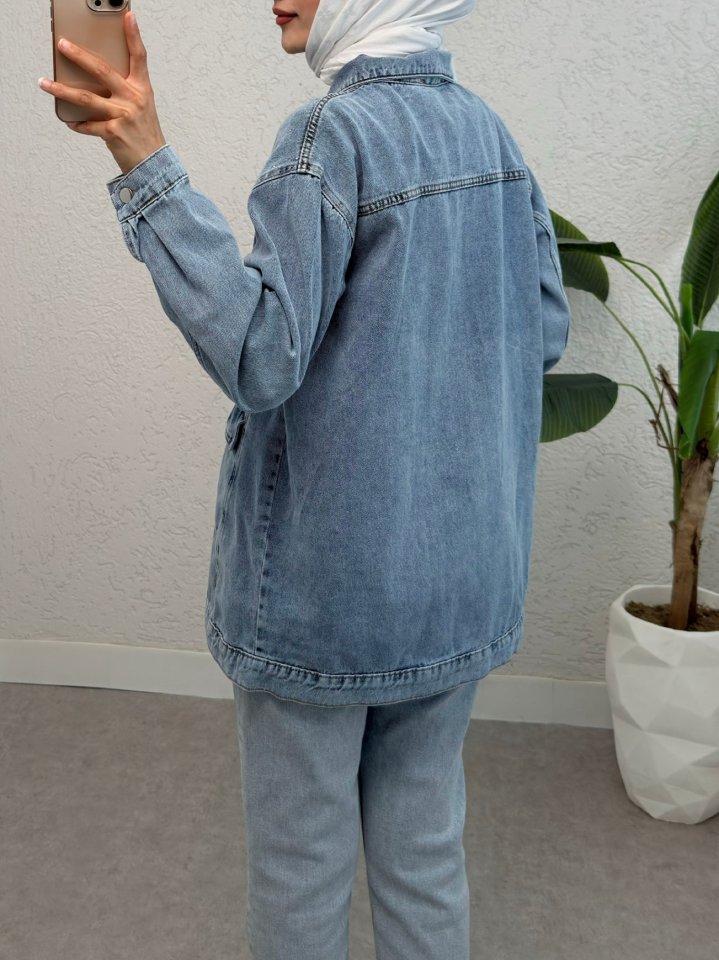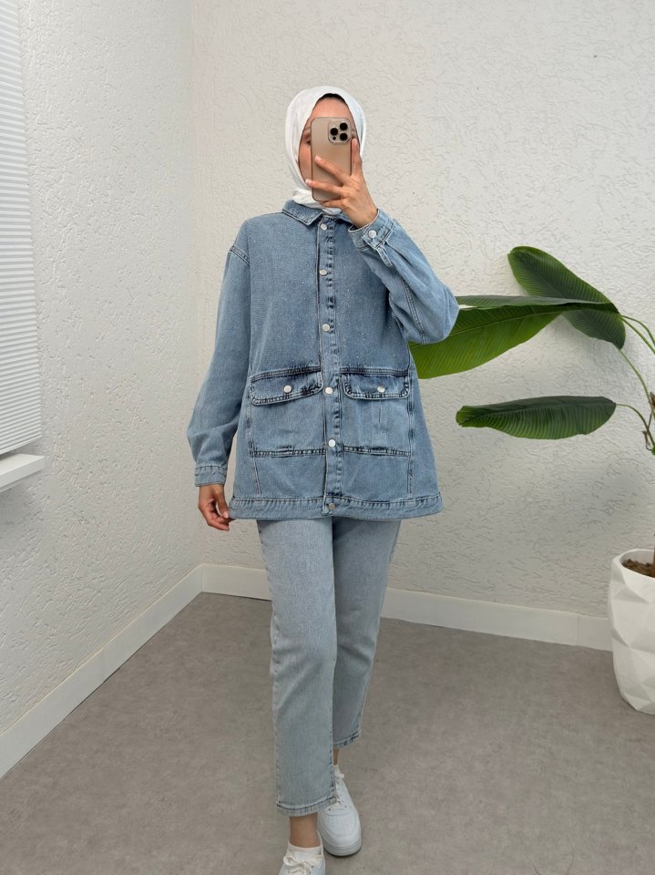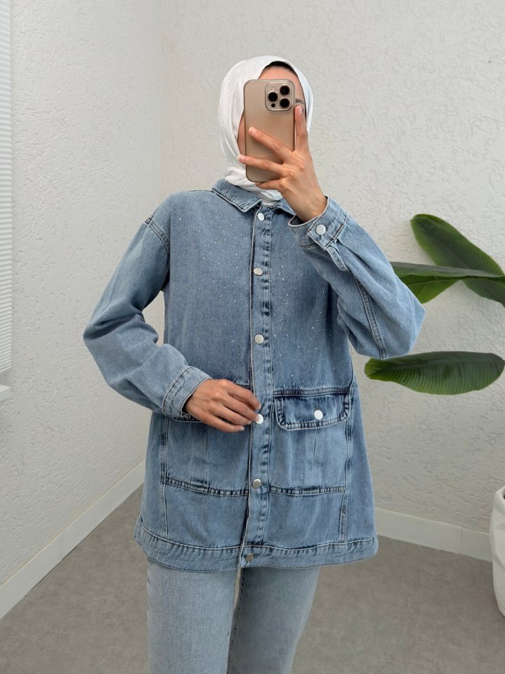 Serpme Taş Detaylı Kapaklı Cepli Kot Ceket -Buz Mavi