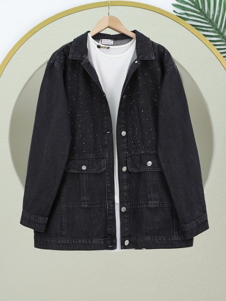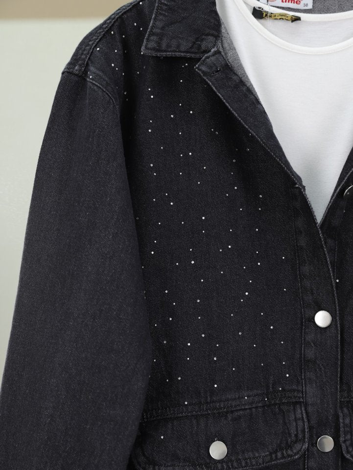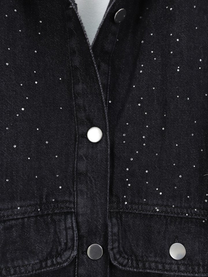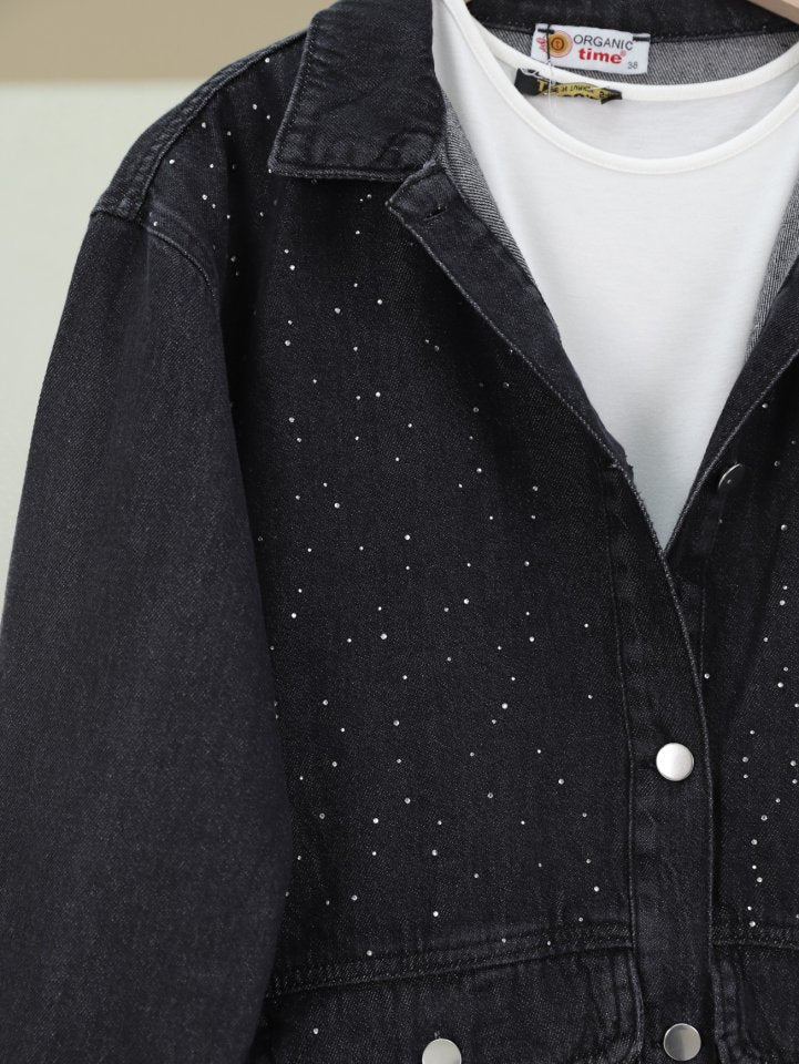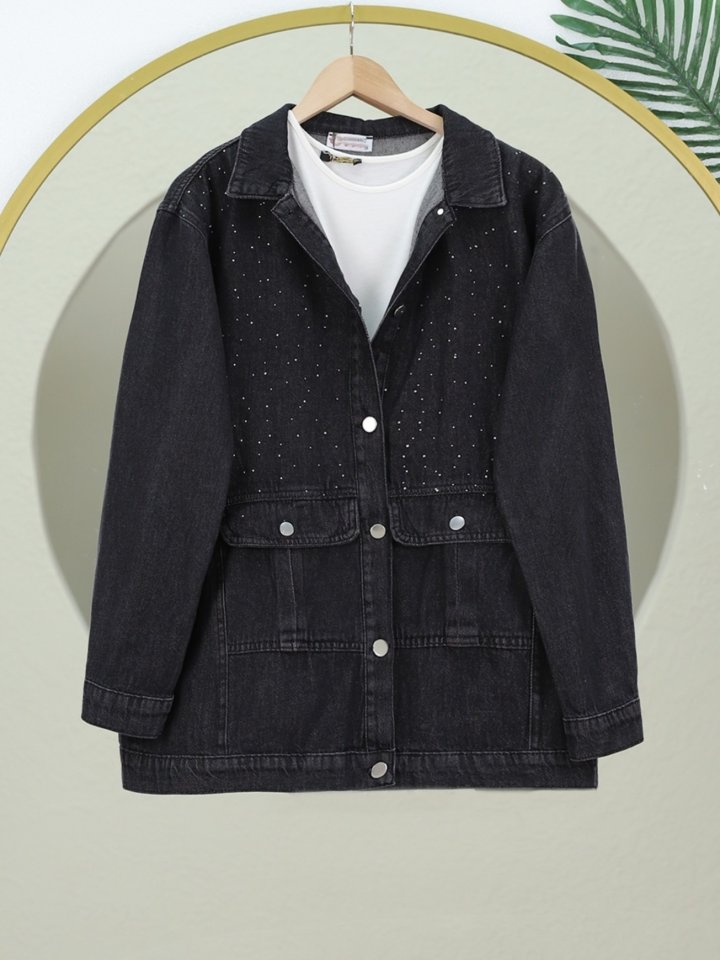 Serpme Taş Detaylı Kapaklı Cepli Kot Ceket -Siyah