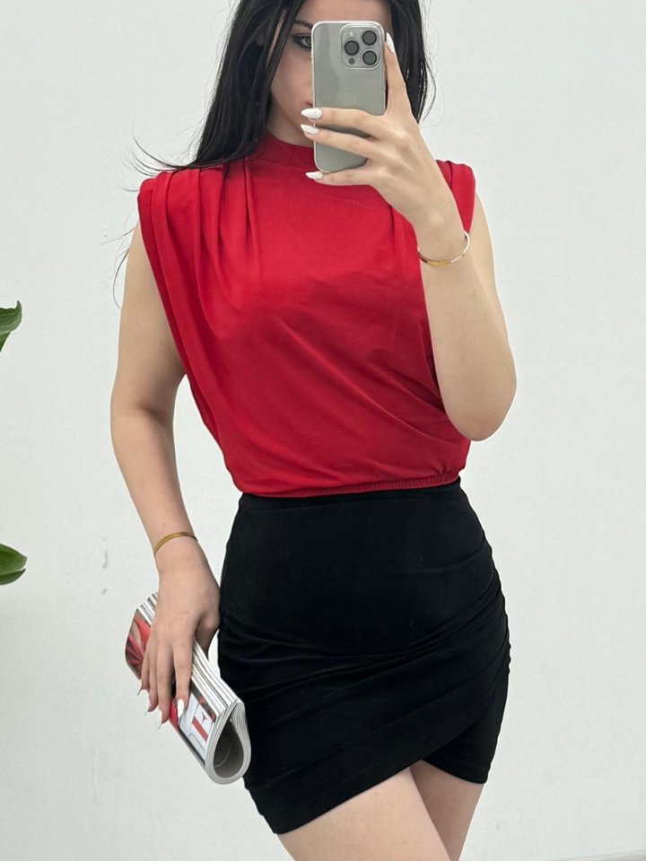 Sıfır Kol Vatkalı Sandy Bluz -Kırmızı