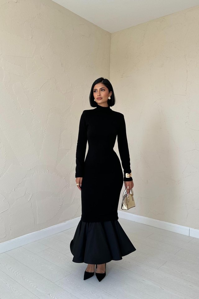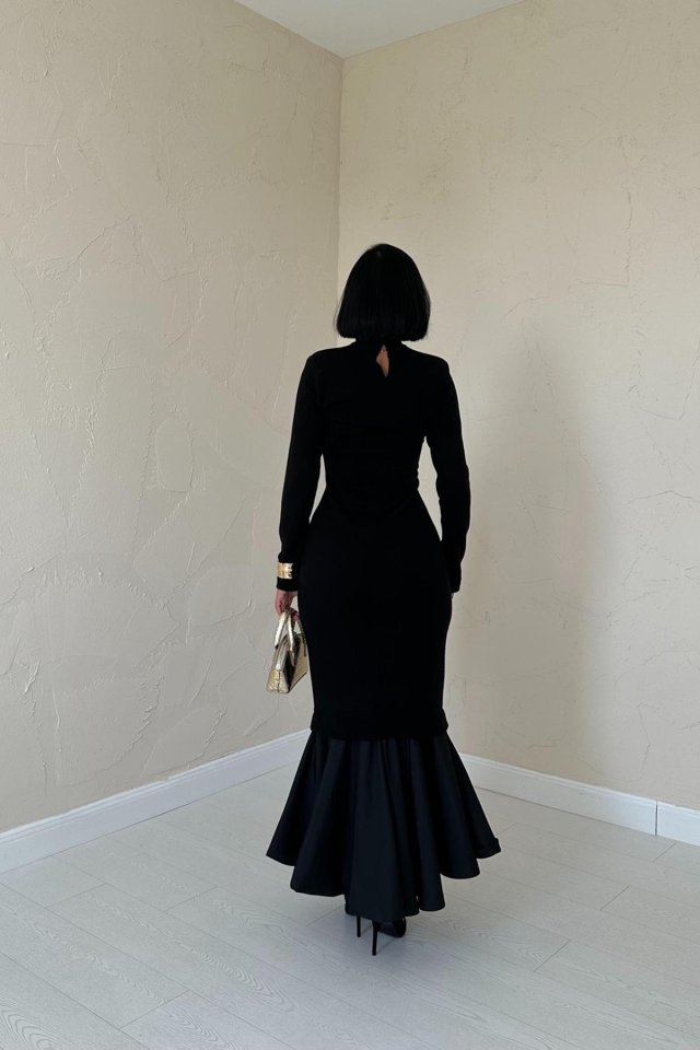 Kadın Uzun Kollu Kruvaze Yaka Büzgü Ve Balon Kol Detay Krep Kumaş Maxi Boy Elbise