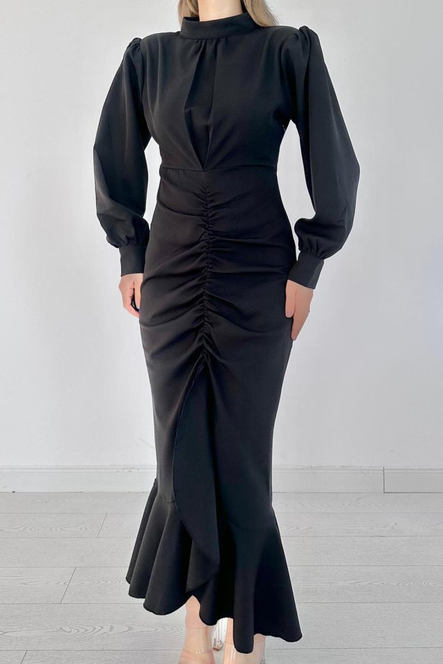 Siyah Volanlı Uzun Kol Elbise