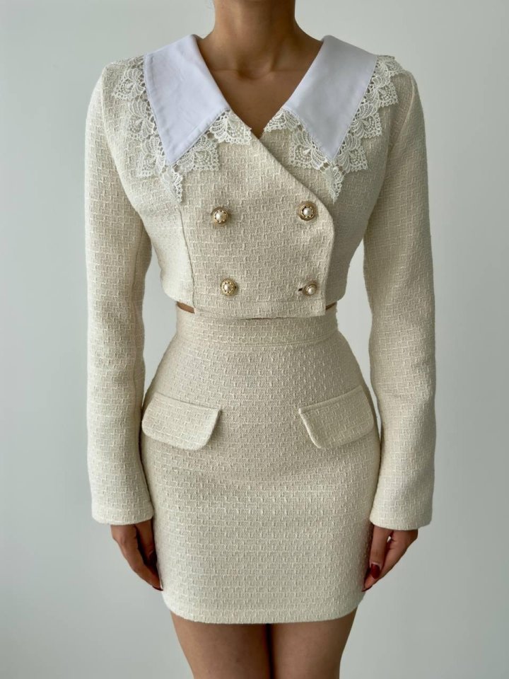 Crop Ceketli Ve Pile Etekli Garnili Takım 10111
