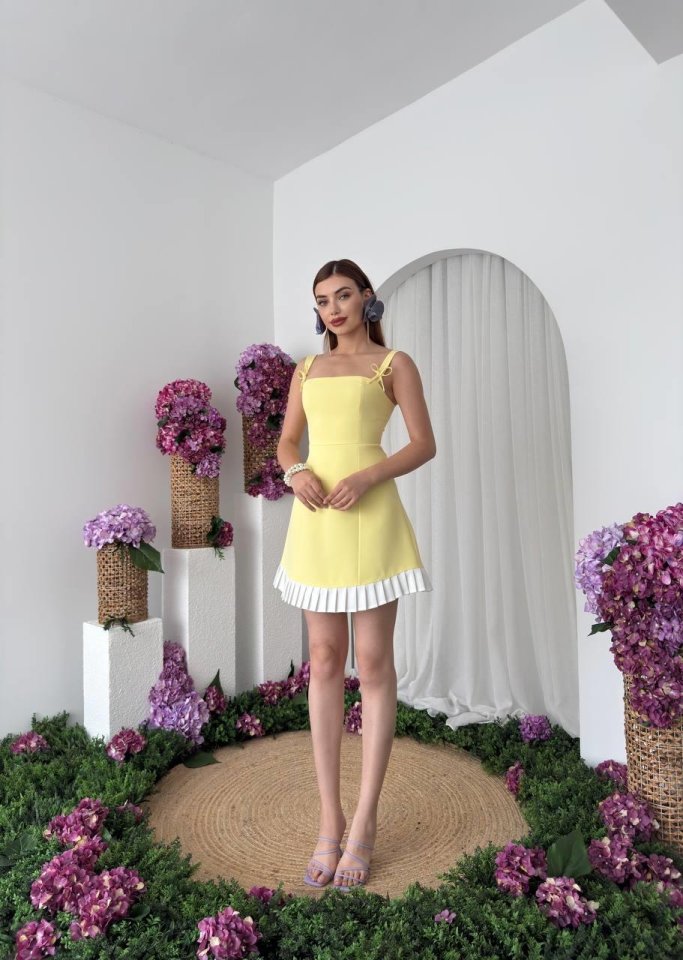 Kadın Kısa Kollu Yakası Açık Katlı Bürümcük Balon Elbise