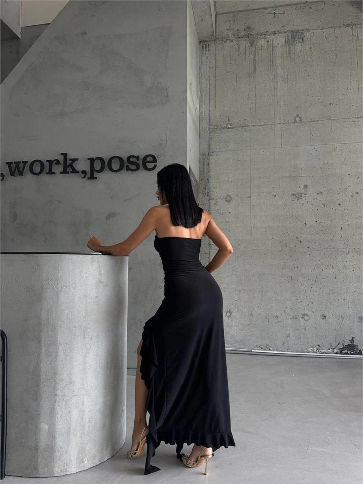 Kadın Askılı Degaje Yakalı Yırtmaçlı Kadife Midi Elbise