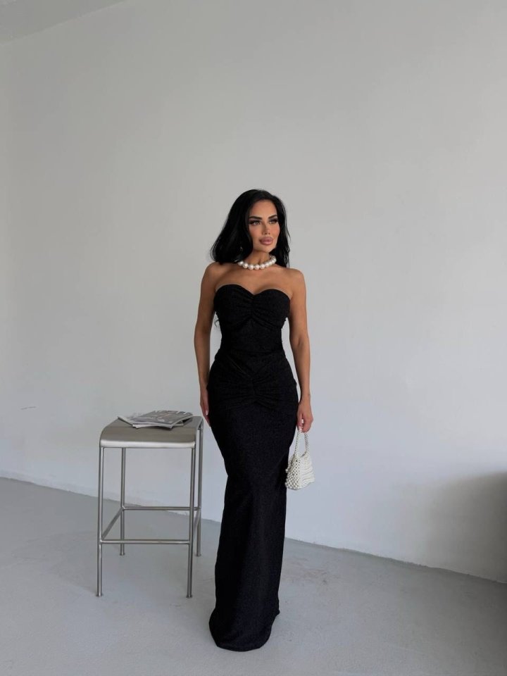 Kadın Uzun Kollu Kruvaze Yaka Büzgü Ve Balon Kol Detay Krep Kumaş Maxi Boy Elbise