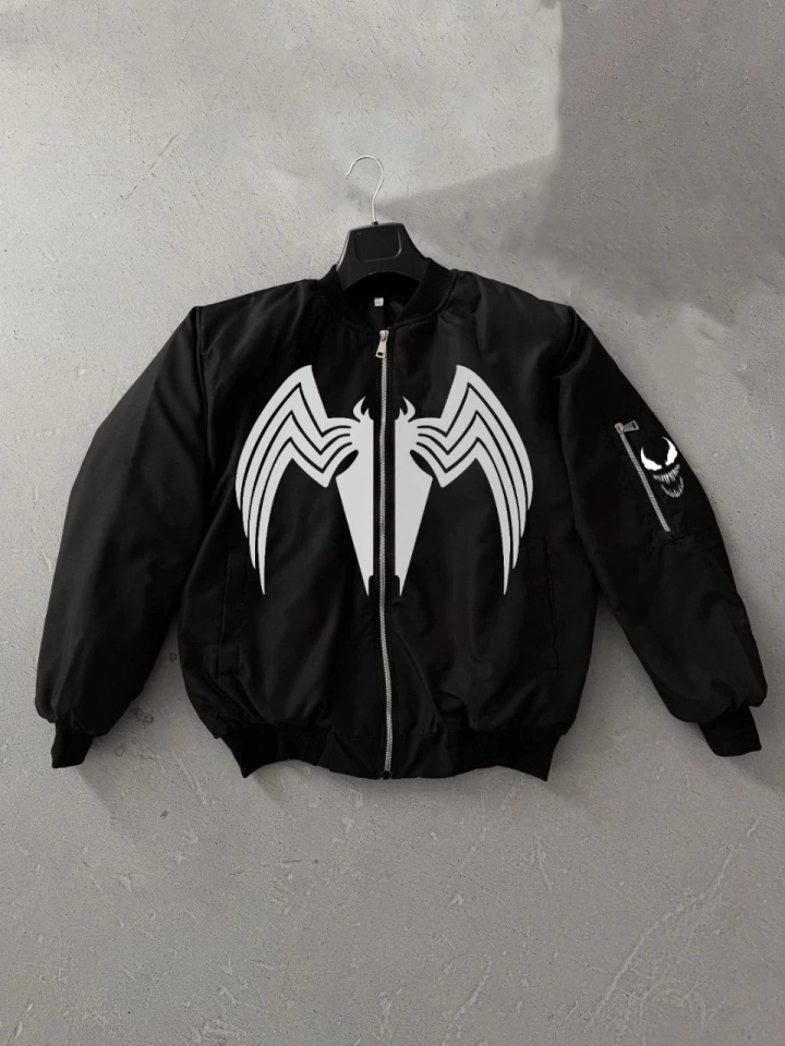 Tam Fermuarlı Uzun Kol Baskılı Bomber Ceket - Siyah