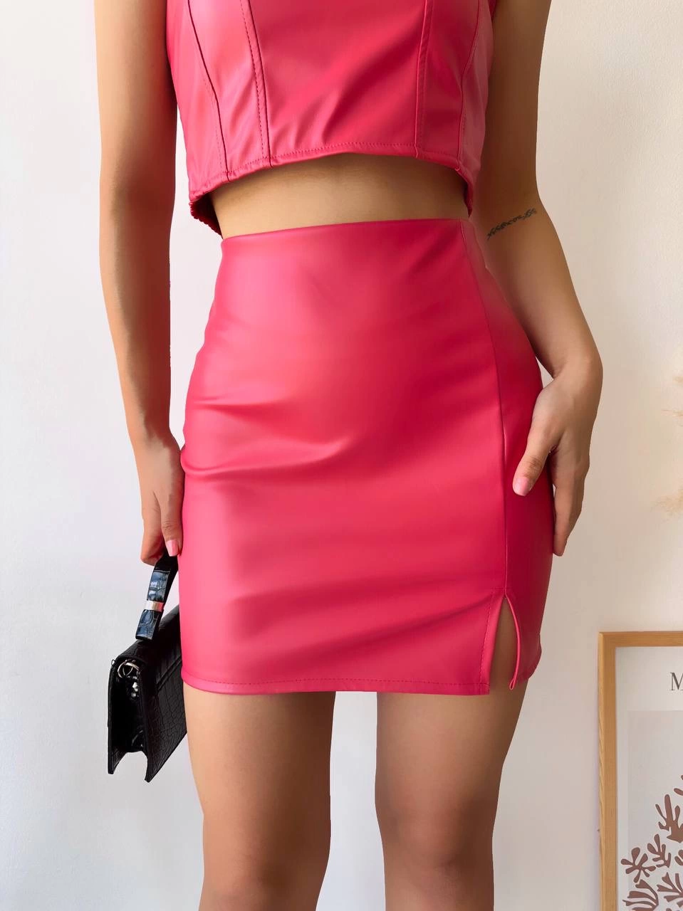 Tek yırtmaçlı arkadan fermuarlı deri etek fuşya s24475