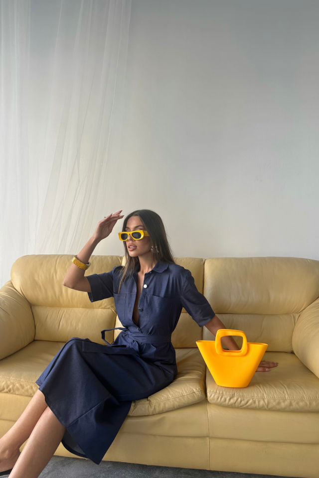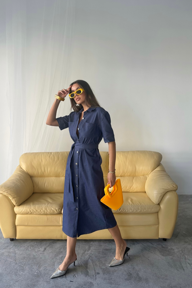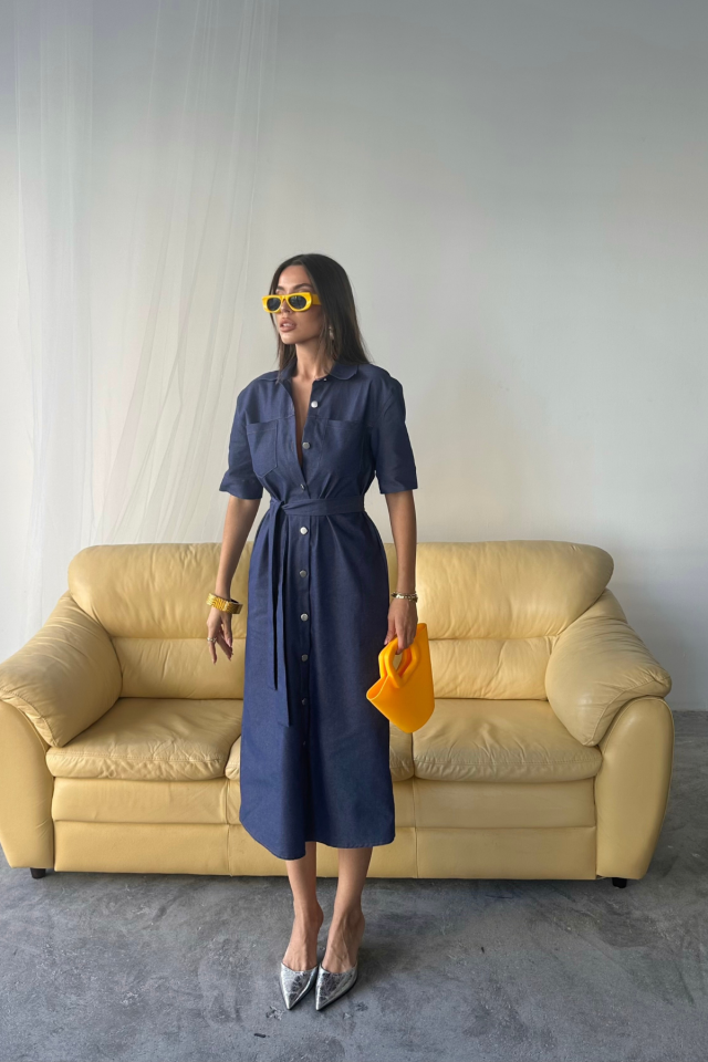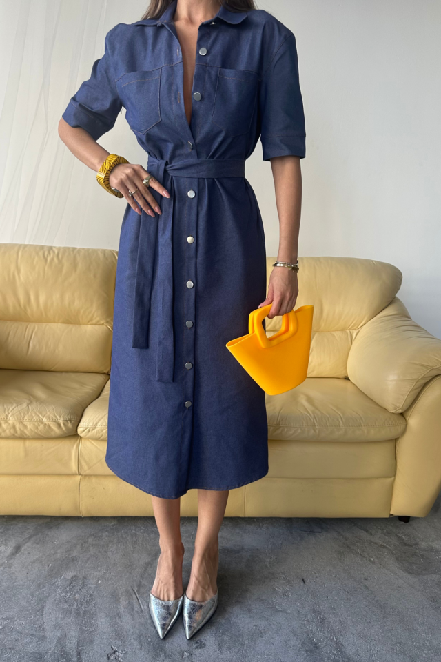 TENCEL ÖNDEN DÜĞMELİ KISA KOL ELBİSE - Mavi