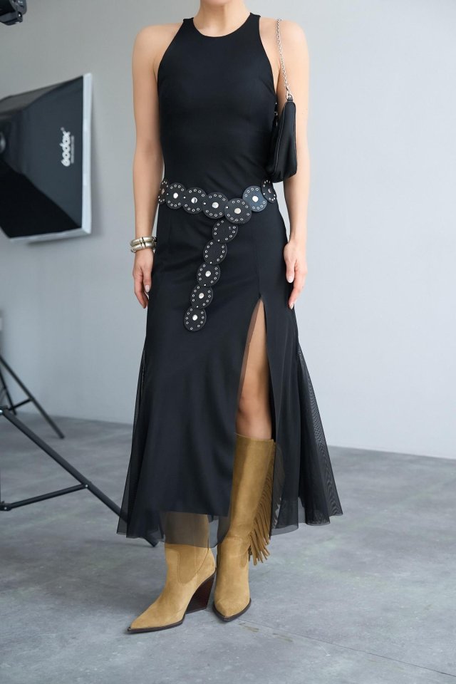 Kadın Askılı Degaje Yakalı Yırtmaçlı Kadife Midi Elbise