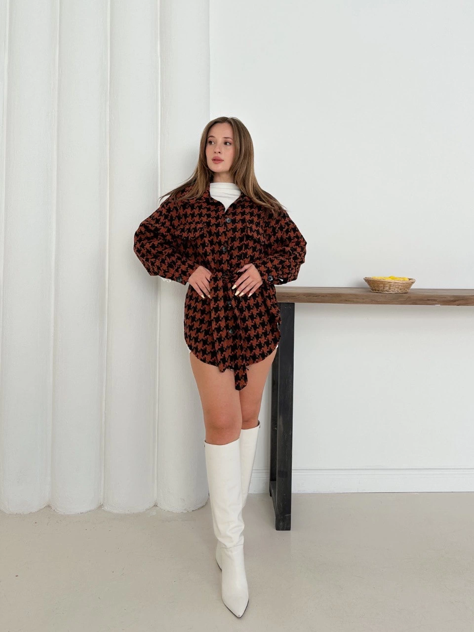 Kadın Uzun Kollu Yakadan Fermuarlı Kot Görünüm Desenli Uzun Modal Bluz
