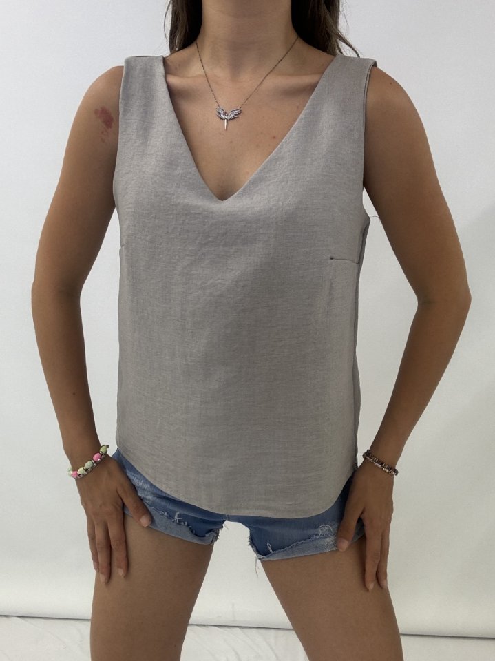 V Yaka Sıfır Kol Keten Bluz -Gri