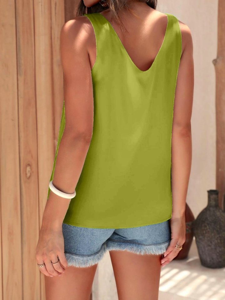 V Yaka Sıfır Kol Saten Bluz -Yağ Yeşili