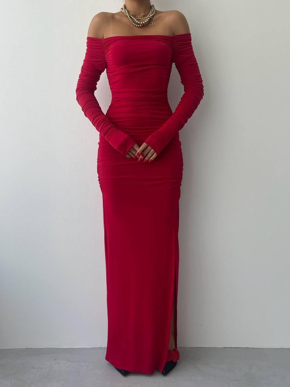 Kadın Uzun Kollu Kruvaze Yaka Büzgü Ve Balon Kol Detay Krep Kumaş Maxi Boy Elbise
