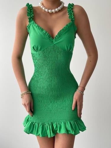 Kadın Kısa Kollu Yakası Açık Katlı Bürümcük Balon Elbise
