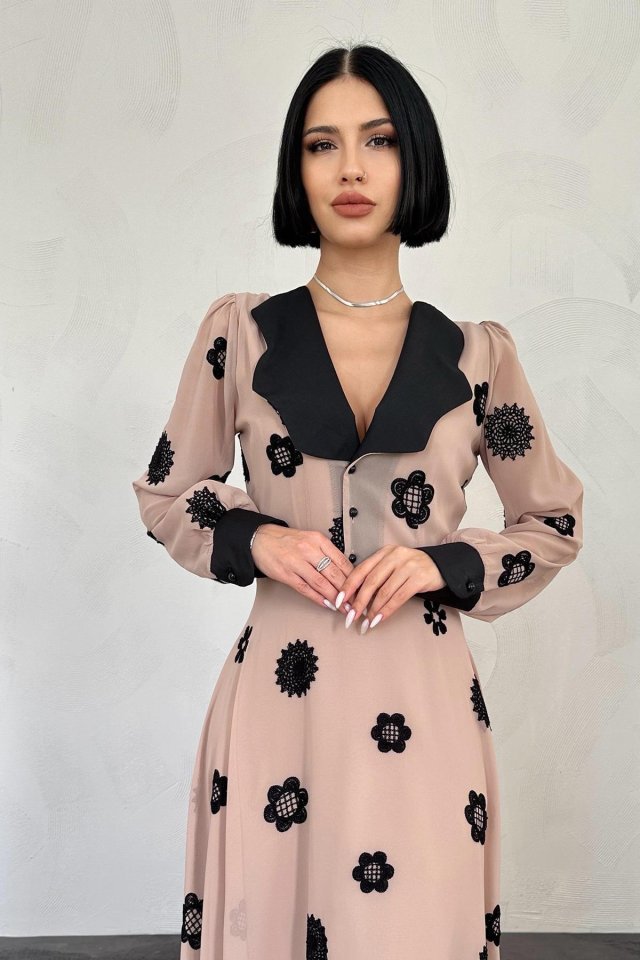 Vizon Yaka Nakışlı Elbise