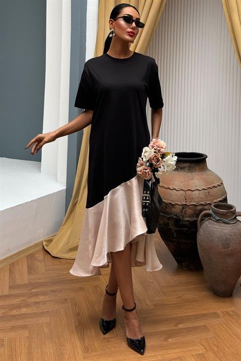 Kadın Kısa Kollu Yakası Açık Katlı Bürümcük Balon Elbise