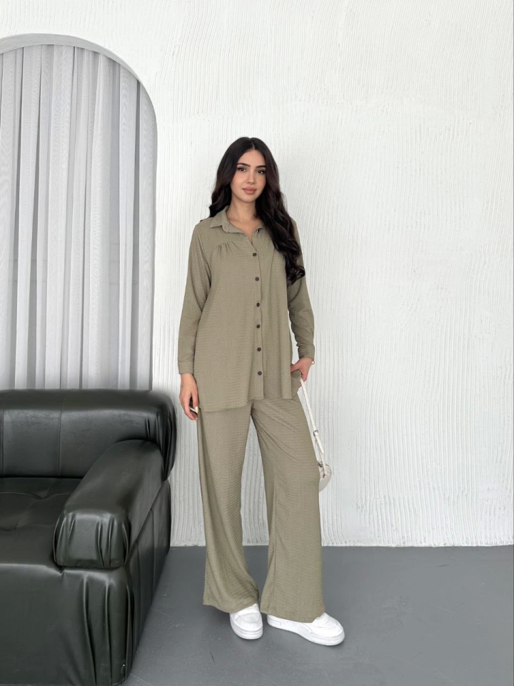 Yakalı Düğmeli Uzun Kollu Gömlek Pantolon Ikili Takım - Bej