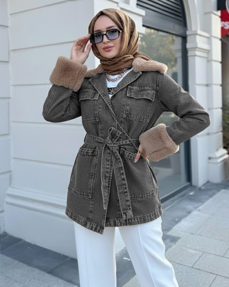 Yakası Ve Kolu Kürklü Önü Bağlamalı Cepli Kot Ceket -Füme