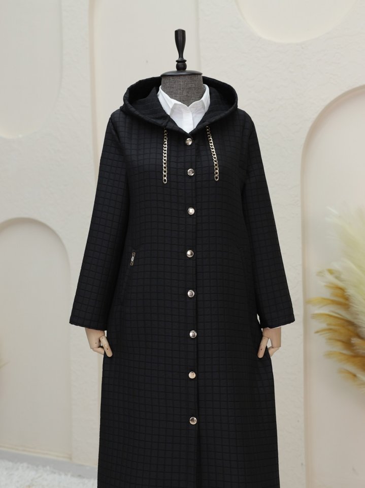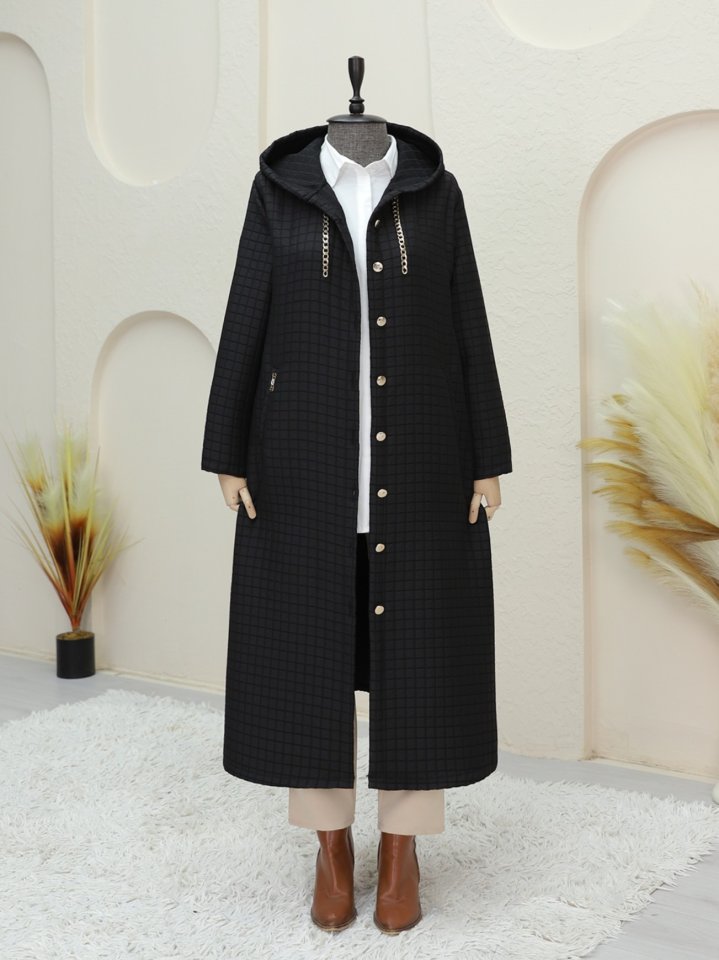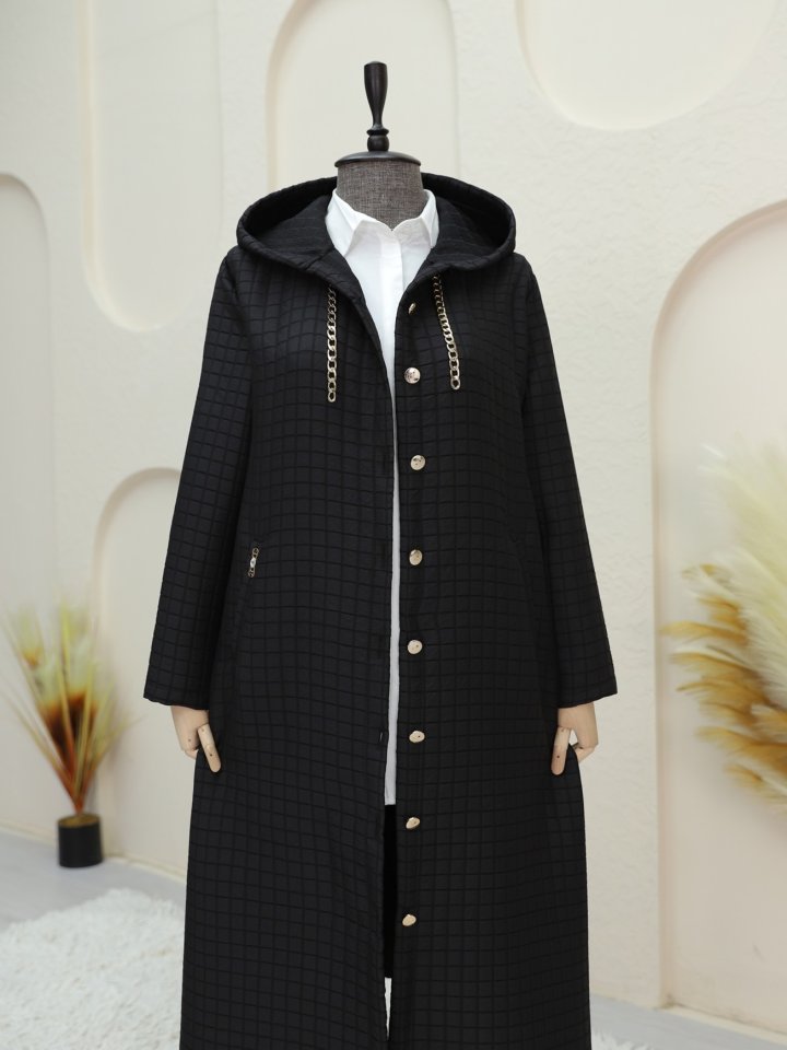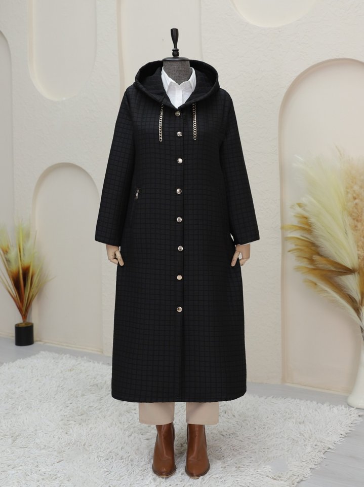 Yakası Zincir Detaylı Uzun Kapitone Kaban -Siyah
