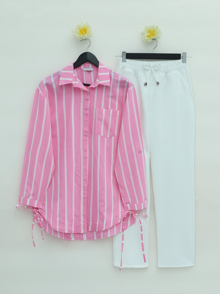 Yandan Bağlamalı Cepli Çizgili Gömlek -Pembe