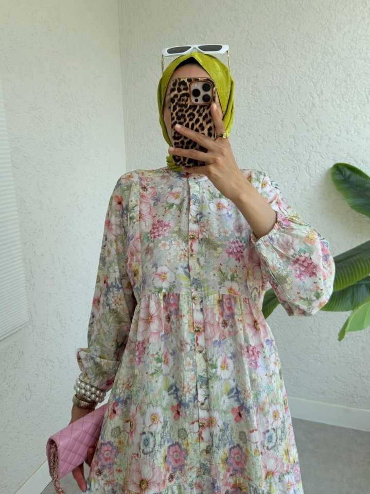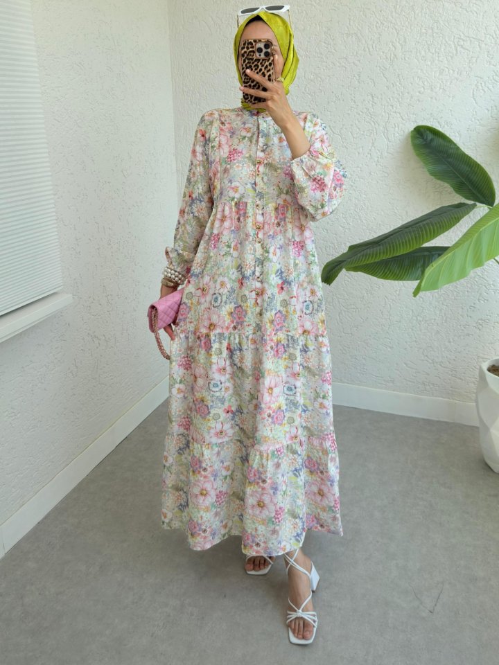 Yarım Düğmeli Kolu Lastikli Çiçek Baskılı Elbise -G.Kurusu