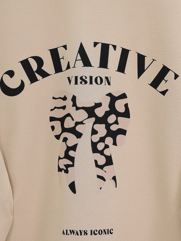 Yuvarlak Yaka Fiyonk Baskılı Leopar Etekli Takım -Bej